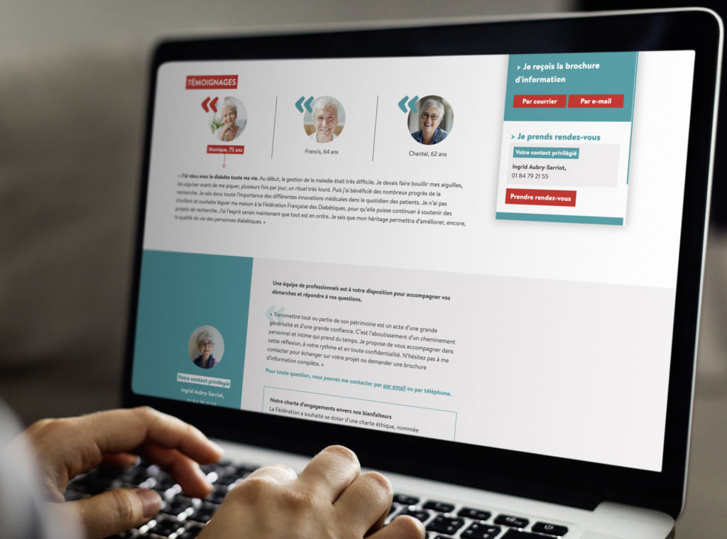 Nous avons conçu une landing page dédiée aux libéralités, « demainsansdiabete.fr », pour développer l’image de légataire de la Fédération Française des Diabétiques, présenter un contact privilégié, susciter le désir d’une transmission de patrimoine solidaire et motiver la prise de contact : une demande de brochure ou une prise de rendez-vous.